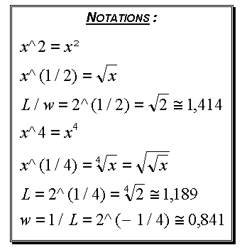 On retrouve bien sûr le très fameux format A4 (21 cm x 29,7 cm) et on vérifie que L/w ne change pas : c’est un invariant de la série normalisée. Nous avons vu plus haut que L/w = 2 ^ (1/2).