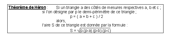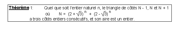 – C'est un triangle dont les côtés ont des mesures qui, exprimées en mètres, sont trois nombres entiers consécutifs ; et son aire, exprimée en centiares, est aussi un nombre entier.
