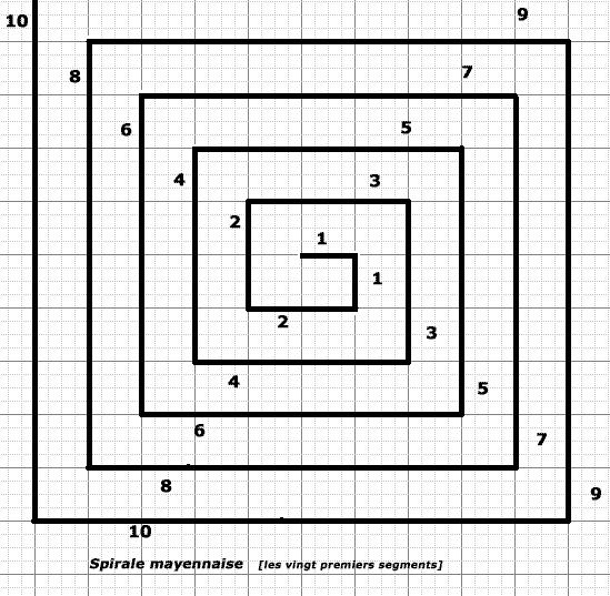 Une spirale mayennaise est une ligne brisée constituée de cinquante-trois segments de droites successifs, dont chacun, à partir du troisième, mesure un centimètre de plus que celui qui précède son prédécesseur ; les deux premiers segments mesurent chacun un centimètre ; deux segments successifs forment un angle droit, et, si l’on parcourt cette spirale depuis son origine, tous les virages sont des virages à droite.