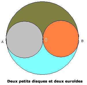 Dans un (grand) cercle de diamètre AB et de centre O, on trace les deux (petits) cercles de diamètres respectifs AO et OB ; le (grand) disque de diamètre AB se trouve partagé en quatre surfaces de même aire : deux petits disques, et deux euroïdes.(cf figure de gauche) La réunion d’un des deux petits disques et d’un des deux euroïdes forme un yin, tandis que la réunion des autres petit disque et euroïde constitue un yang. Le yin diabolique (en noir sur la figure de droite) a un périmètre de 666 millimètres. |
