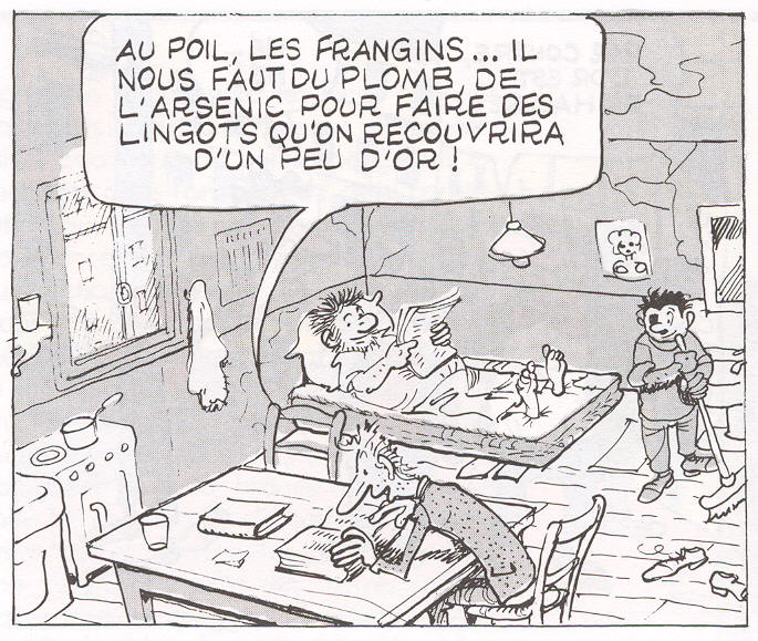 Avec du plomb, de l’arsenic et un peu d’or, Croquignol a réussi à fabriquer 9 faux lingots ; de son côté, Filochard, champion de la débrouille a pu se procurer (malhonnêtement) 4 vrais lingots. Doté d’un sens du commerce assez développé, Ribouldingue parvient à céder à Norbert le Fourgue 6 lingots choisis aléatoirement parmi les 13 (dont 4 seulement sont vrais) dont dispose le trio, pour la coquette somme de 24 000 €. Plus tard, Norbert le Fourgue constate qu’il a été roulé, se débarrasse des faux lingots et revend chaque vrai lingot 13 000 €. |