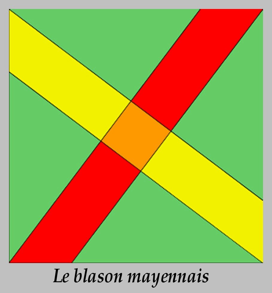 Léon a imaginé pour la Mayenne un blason de sinople (vert) barré de gueules (rouge) et bandé d’or (jaune), barre et bande se superposant pour former un carré orangé de 99 mm de côté.