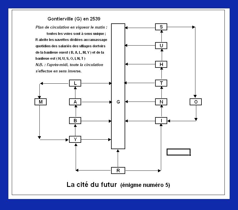 En 2539 à Gontierville (G), au sud de l’ancien département de la Mayenne, qui regroupe nombre d’entreprises, les salariés qui habitent pour la plupart les villages dortoirs situés alentour empruntent chaque matin les voies à sens uniques (voir figure) pour se rendre à la ville, dans leur véhicule personnel héliopropulsé, ou par les navettes au lavalium qui, partant de Ramar font le tour de la banlieue ouest ou celui de la banlieue est avant de rejoindre la ville. [le soir, les sens de circulation sont inversés afin de permettre à chacun de regagner son village]. Mathus-André ne travaille pas - il a pris sa retraite il y a un peu plus de 530 ans, lorsque c’était encore possible - et, habitant Ramar (R), se rend à Gontier chaque matin sur son deux-roues du XX ème siècle en respectant les sens de circulation ; il lui arrive de faire de très grands tours, par l’ouest ou par l’est, traversant alors un grand nombre de villes étapes ( par exemple, si son circuit est RYBALMYBALMYBAG, il y a treize villes-étapes, car on ne compte ni la ville de départ R, ni la ville d’arrivée G ) .